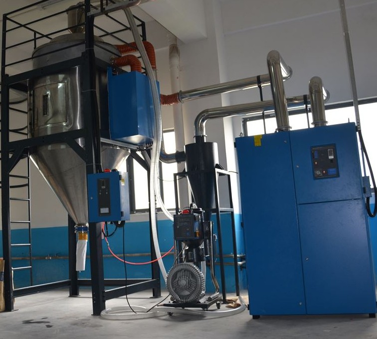 中央供料系統采用高壓風機真空輸送方式,通過集中的管路系統將塑料原料從儲料罐輸送到中央干燥系統,然后將干燥后的原料輸送到每臺注塑機中。